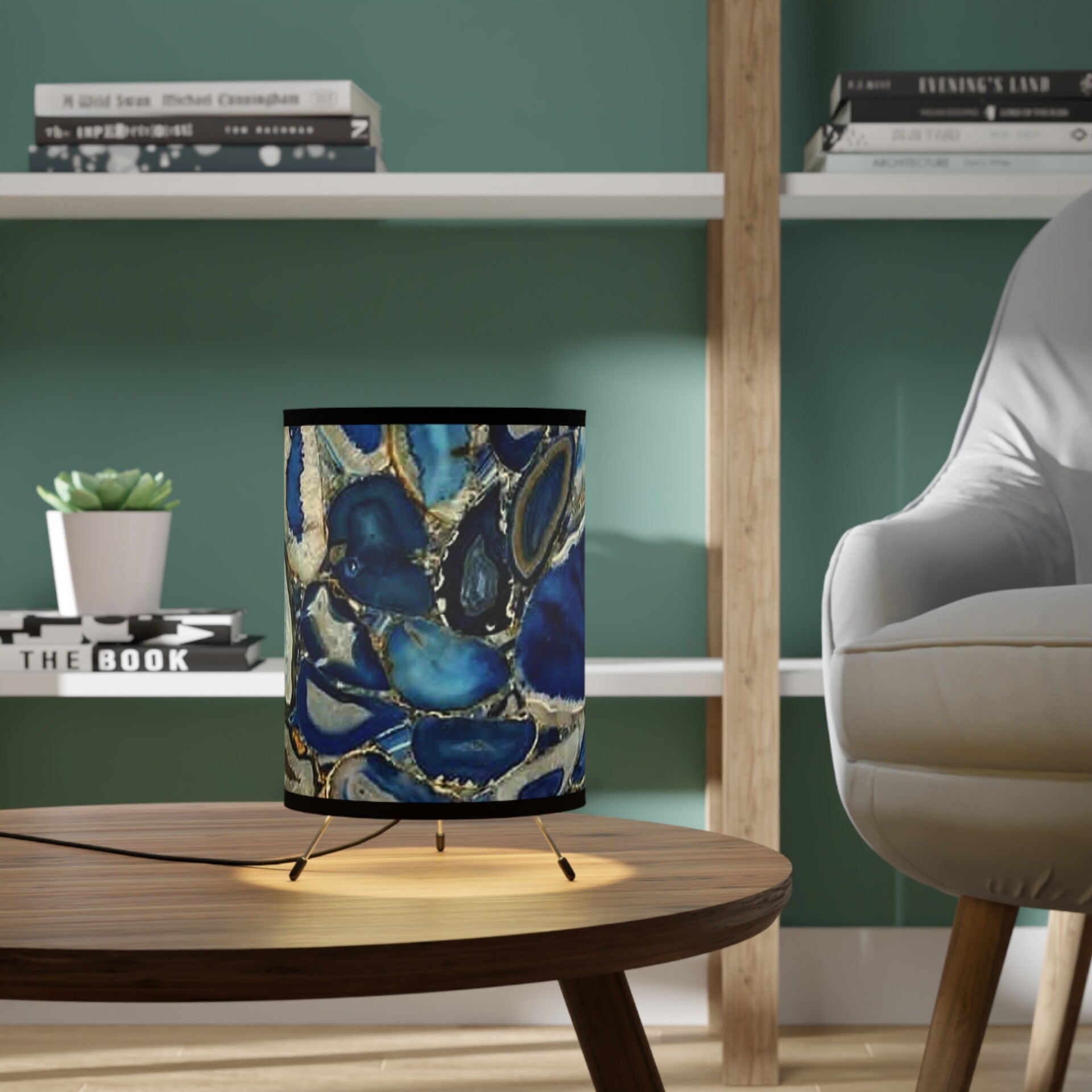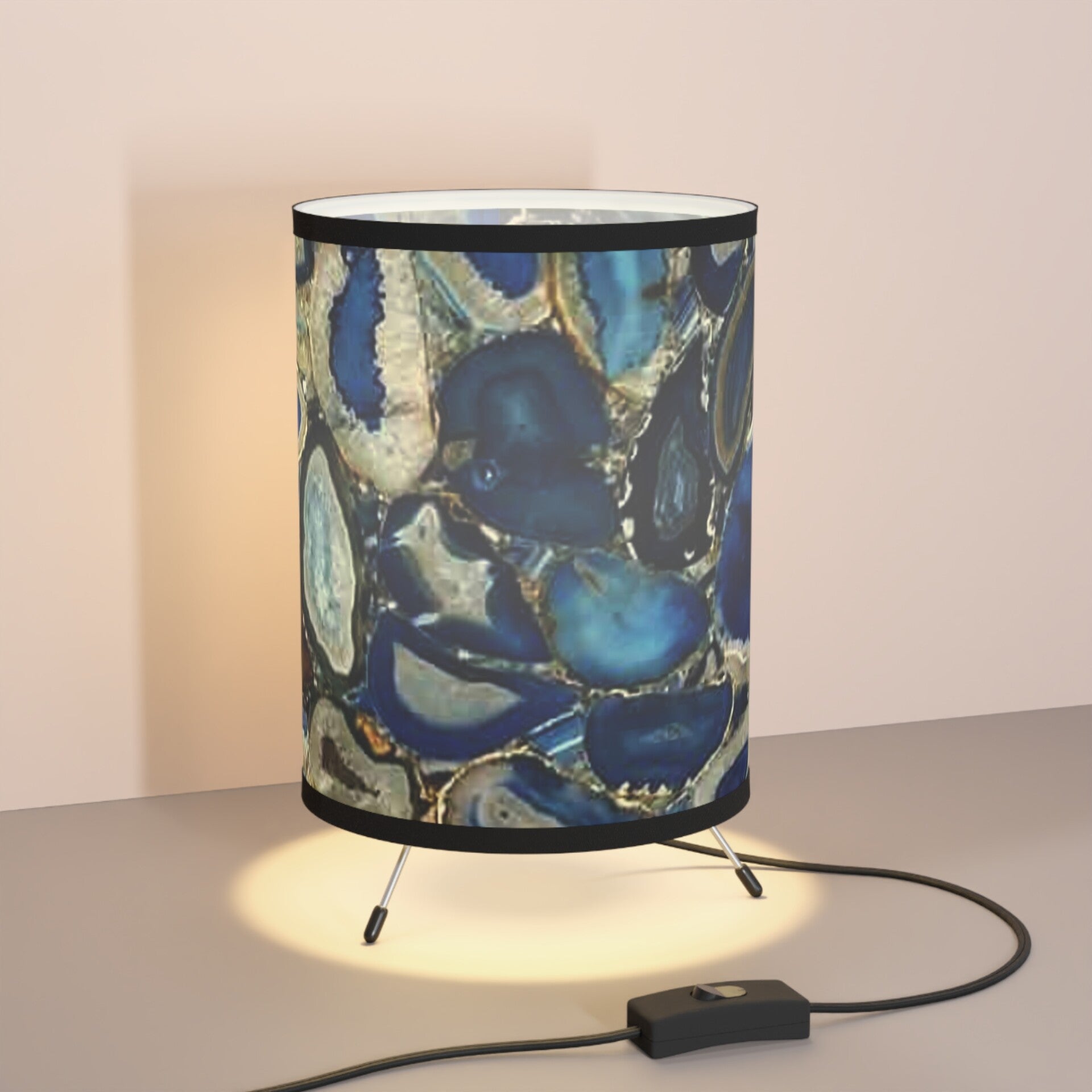 Boho Tripod Lamp with High-Res Printed Shade, Artisan Lighting, Home Decor, Unique Gift, Bohemian Style, Blue Agate, Marble Design. Custom